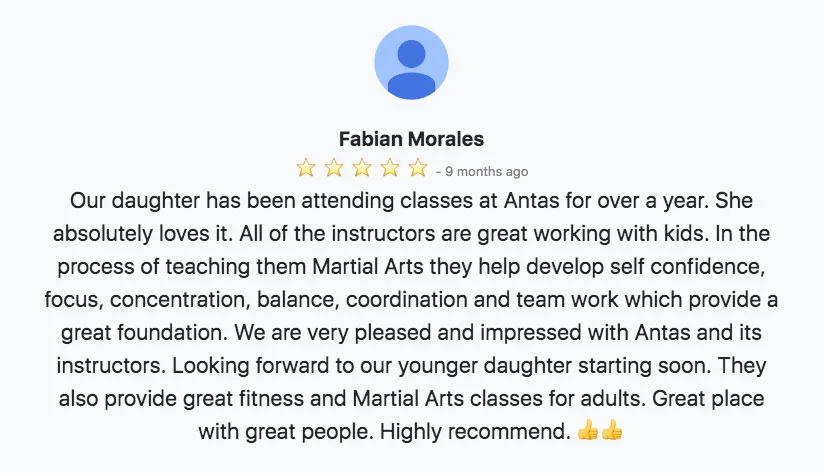 As parents, we wanted our daughter to have the proper tools and knowledge to be able to defend herself in a dangerous situation. I think we always knew that Madison was going to be in some kind of Martial Arts program; however, we did not imagine just how amazing her experience would be. Madison started at Anta’s Fitness and Self Defense when she was just a few weeks shy of turning 4 years old. We still remember her first trial class, she was part of a group called Little Ninjas and during her first class Madison kept smiling, laughing and she was just having an amazing time. Over the years, that “Little Ninja” has turned into an amazing Martial Artist who loves Kung Fu and has true passion and dedication for her sport. Presently, with the help of Mr. Anta and Mr. Arcia, Madison’s determination and strong spirit continues to grow. They aid in building character and strength, with a great deal of focus on discipline and respect toward others. Our daughter has learned how to be socially confident and has an impressive drive and determination towards all aspects of her life. Thanks to her experience with Mr. Anta’s academy, Madison excels in school and with outside activities. She even had the chance to participate in a statewide Martial Arts tournament placing 1st in Open Hand/traditional forms. All of these experiences are helping us in shaping an amazing human being with determination, drive and respect. Both her instructors have been a significant component of everything it takes to shape a confident, humble and loving human being.Madison Barios Mom